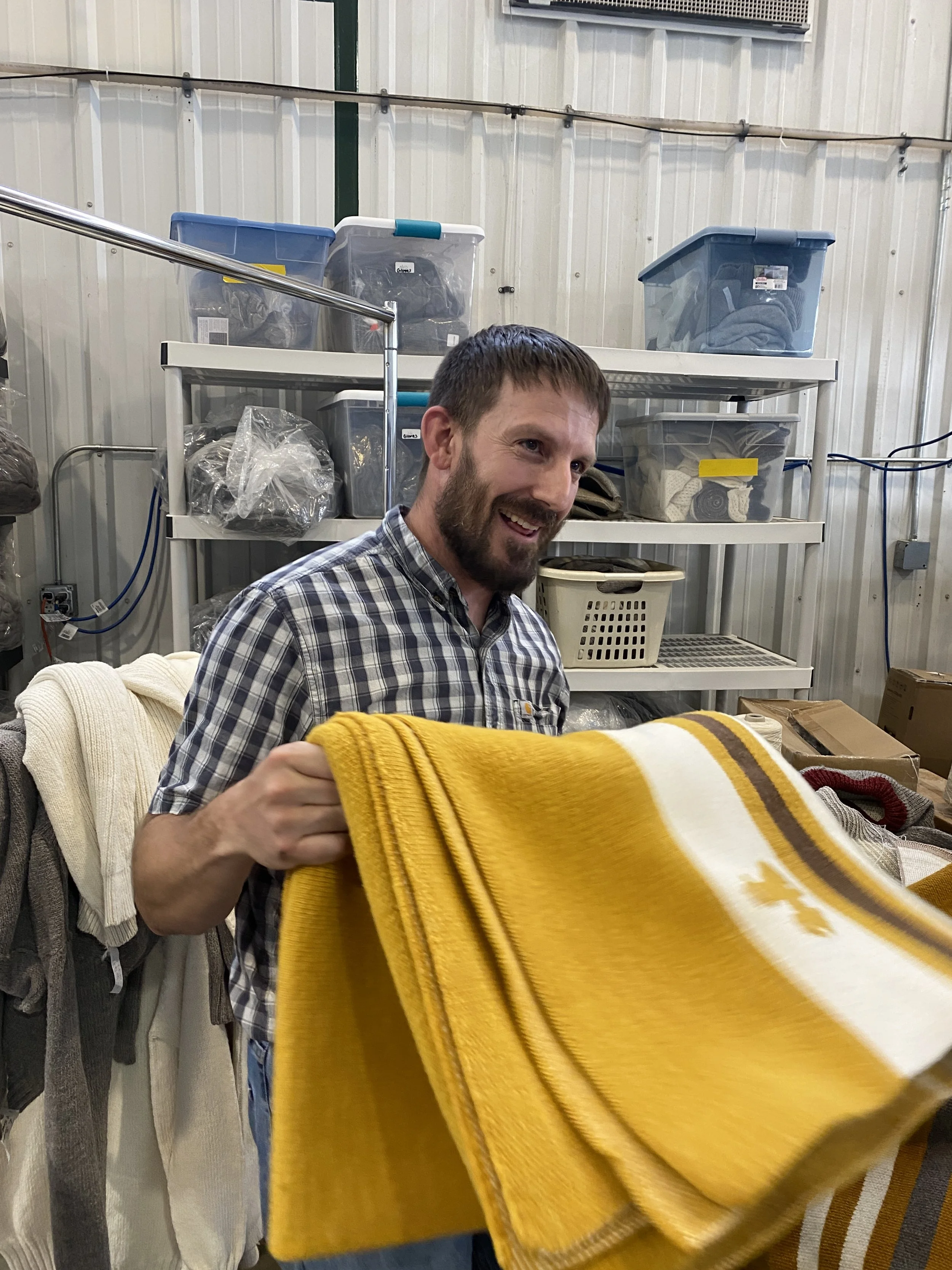 Their work prioritizes quality, sustainability, and the unique beauty of every wool batch, honoring the fiber’s natural story. From the mills, our yarn is entrusted to skilled weavers who carry on the timeless craft of handweaving, helping keep American textile traditions alive and well.