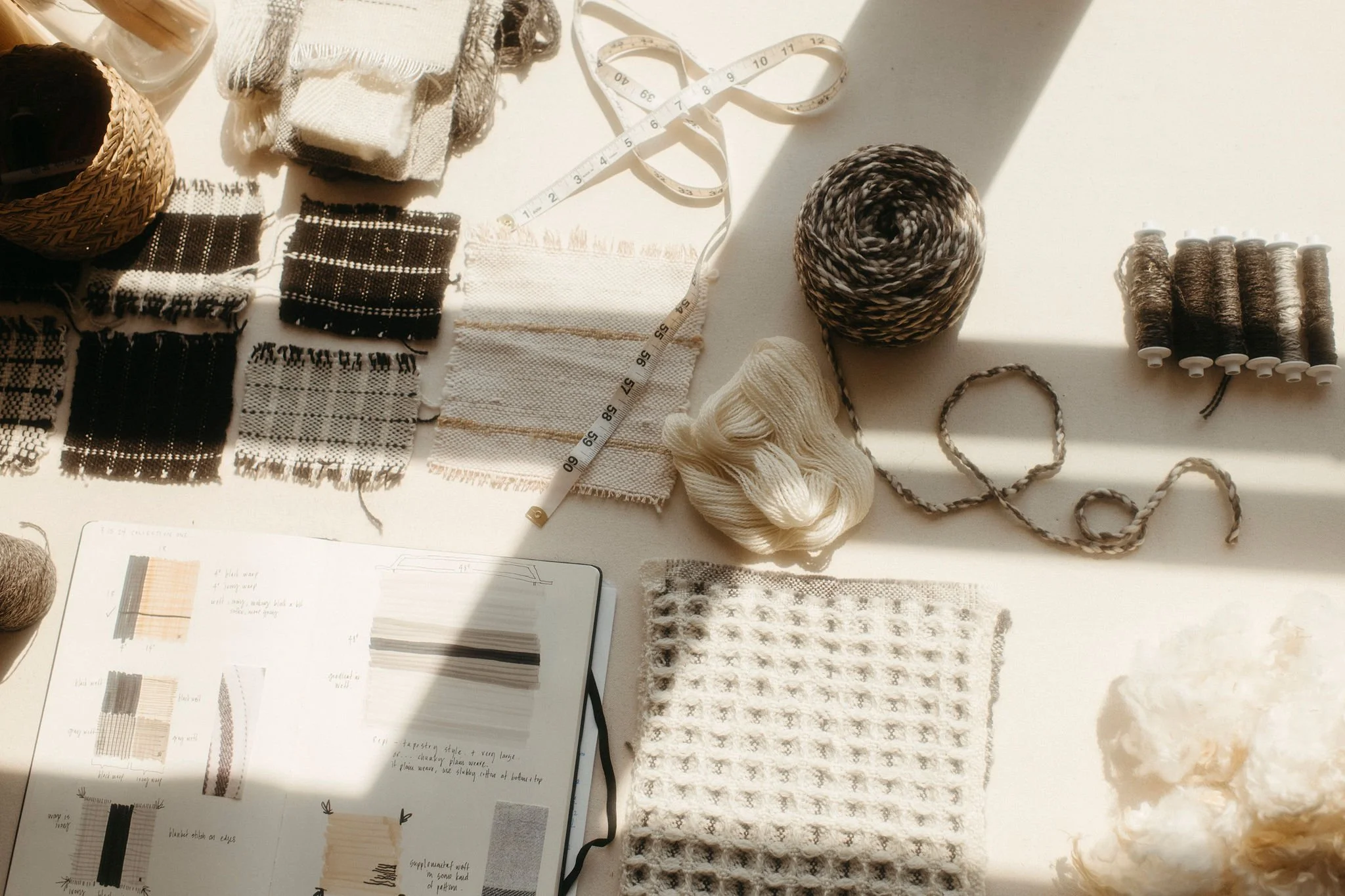 Along with the handwoven samples I gather detailed design files that include notes on fiber content, sett, weave structure, dimensions, and finishing instructions. These materials are sent to our production weavers — highly skilled artisans who work on traditional floor looms or small-scale mechanized looms, depending on the scale and complexity of the design.